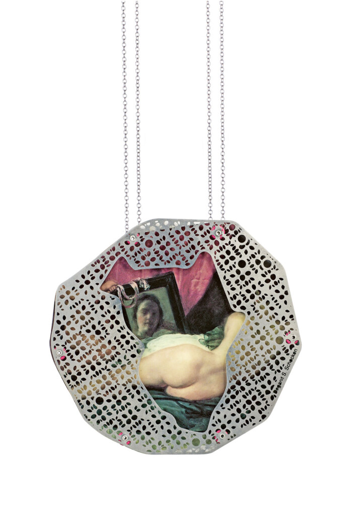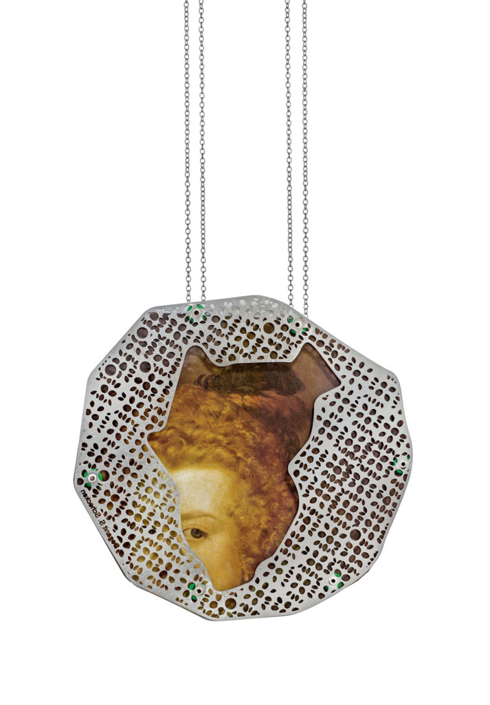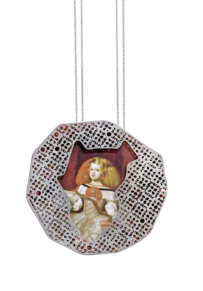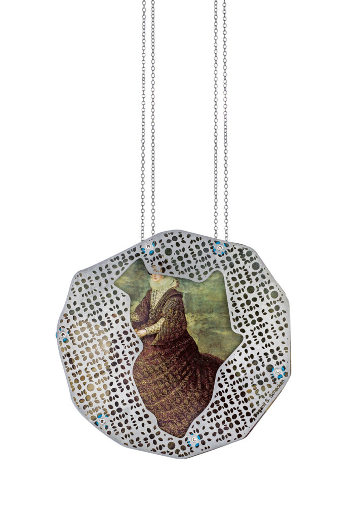 In the Air (Velázquez),neck-piece, 2012Stainless steel, silver,aluminum, paper, plastic9 × 9 cm